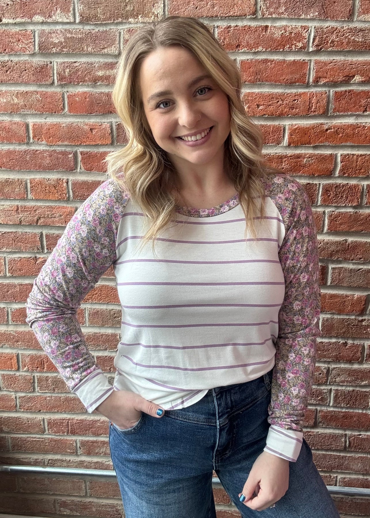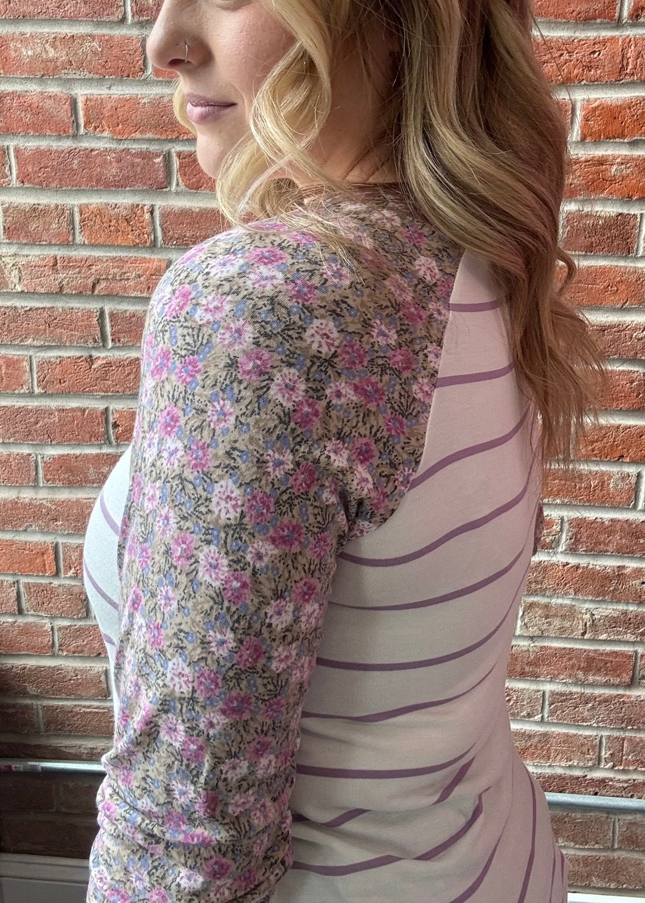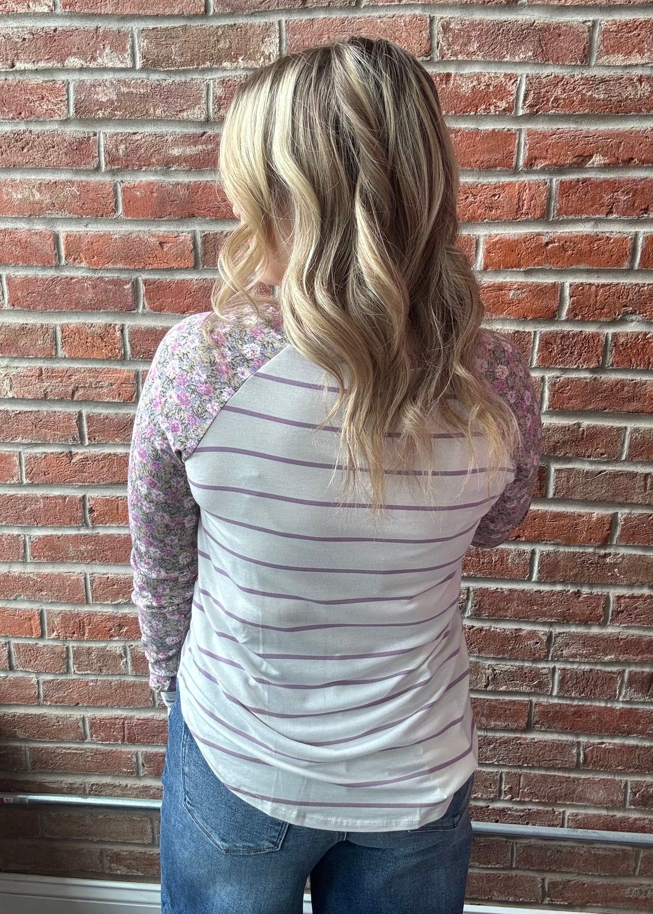 Get ready for the Daily Dash your new favorite lightweight essential. Featuring a relaxed round neck, long sleeves, and playful ivory and lilac stripes, this piece is made for mixing and matching. Throw it on with your favorite pair of denim and go!