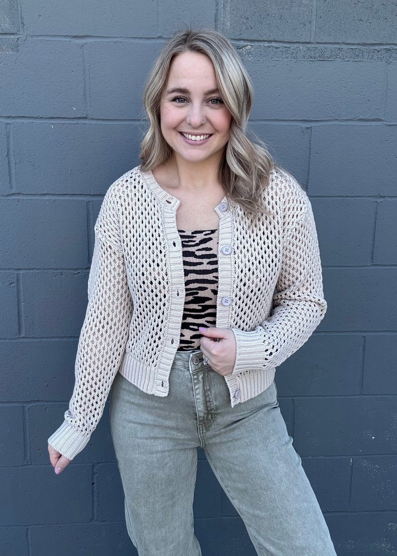 This cropped sweater is the absolute cutest addition to your spring and summer wardrobe! Perfect for layering over a top to keep you warm without sacrificing your look! The sand beige is versatile enough to wear with any piece you already own, or a few new ones too!