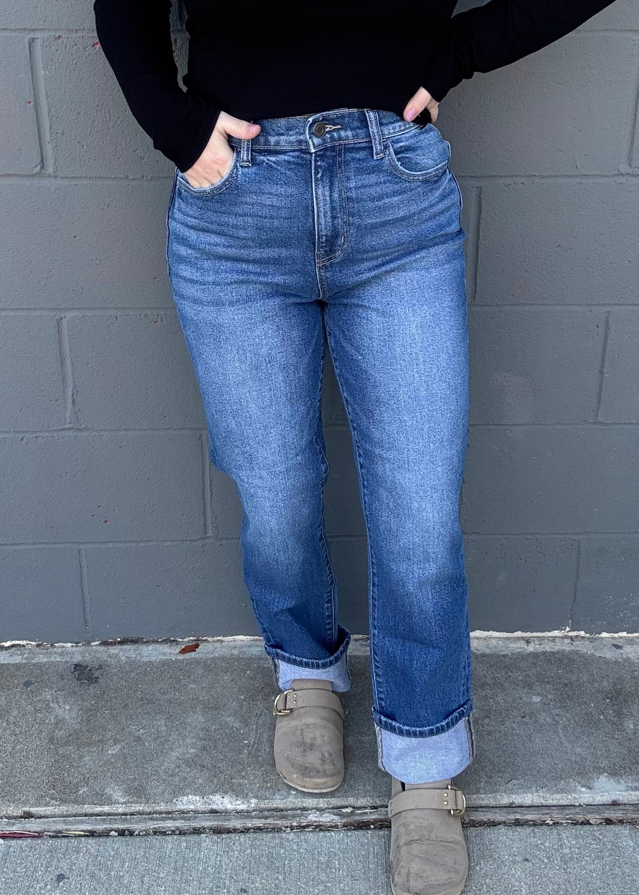 The perfect pair of denim does exist! These jeans are the everyday style with an adorable cuffed roll at the bottom. The medium wash and no distressing make for an easy outfit decision in the morning no matter what you’re doing!